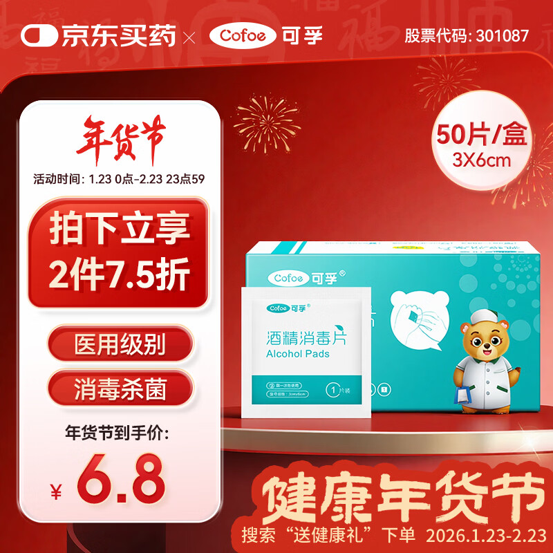 可孚 医用75%酒精棉片酒精消毒湿巾杀菌一次性家用护理 50片3cmX6cm