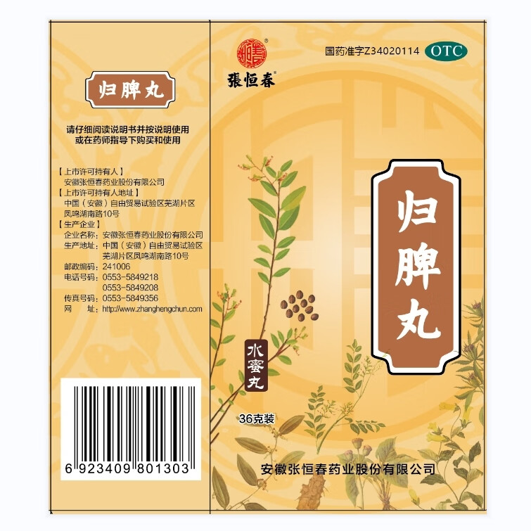 张恒春 归脾丸 36g/瓶 益气健脾 养血安神 失眠多梦