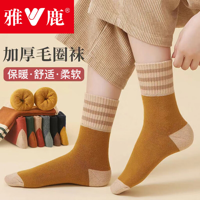 雅鹿袜子女加厚秋冬纯色情侣保暖毛圈中筒袜 混色【随机】 2双 均码