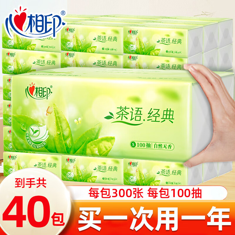 心相印抽纸纸巾茶语3层100抽面巾纸母婴可用餐巾纸卫生纸面纸家庭装 3层 100抽*40包 整箱