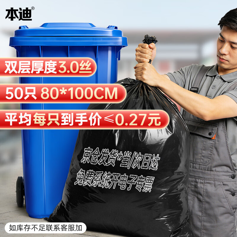 本迪物业大垃圾袋黑色80*100cm*50只单面1.5丝保洁加厚款特大号垃圾袋