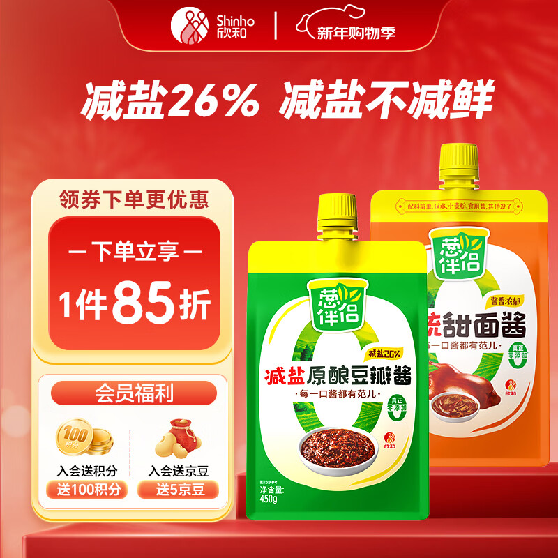 葱伴侣传统甜面酱450g加嘴装+减盐原酿豆瓣酱450g加嘴装组合装 欣和出品