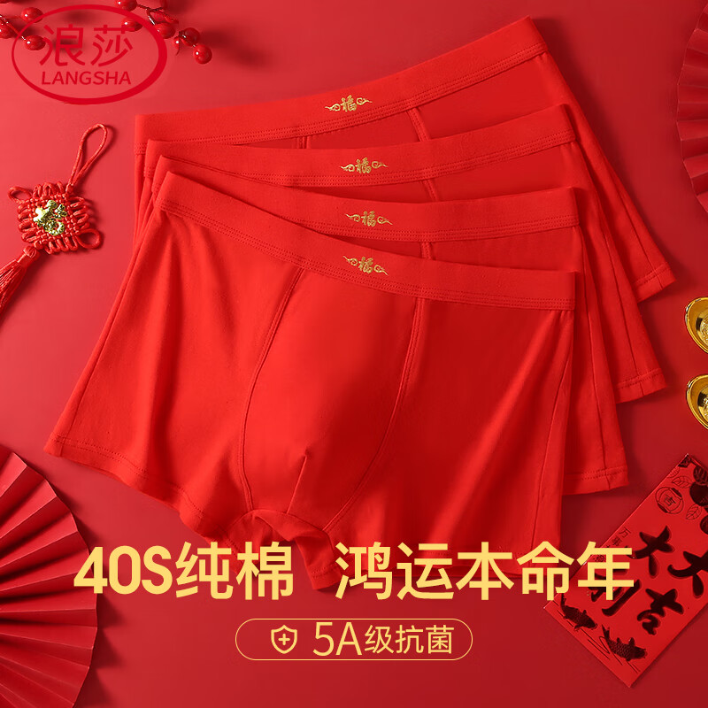 浪莎大红内裤男纯棉本命年蛇年结婚4条礼物大码裤衩喜庆平角男士内裤
