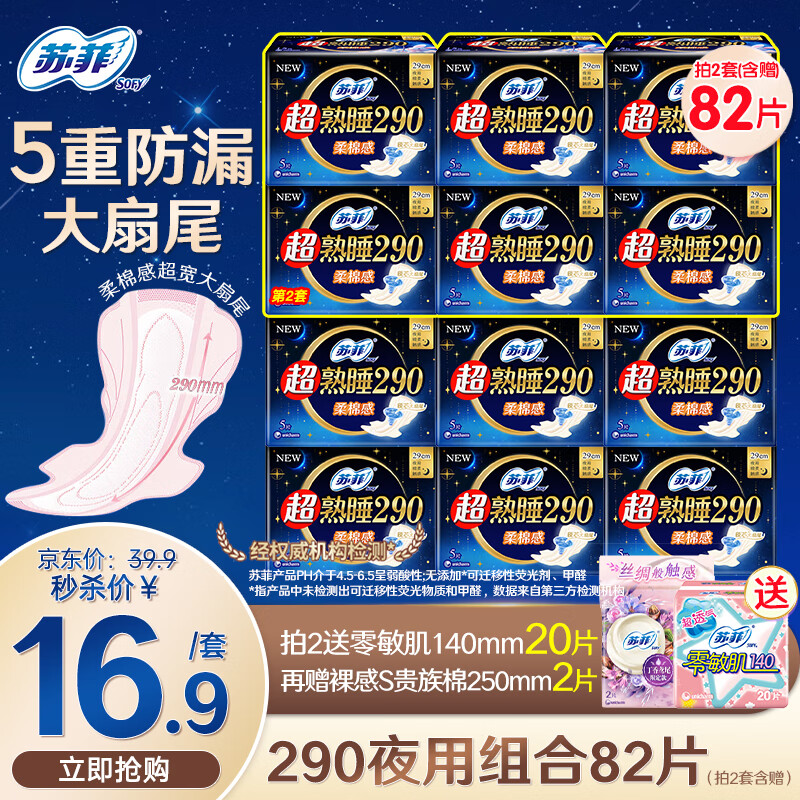 苏菲卫生巾夜用290mm姨妈巾超熟睡量大加长量多整箱套装批发 精选日夜用30片【今日特慧】