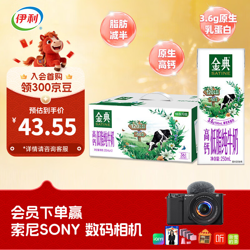 伊利金典高钙低脂牛奶250ml*12盒/箱 脂肪减半 礼盒装 1月产