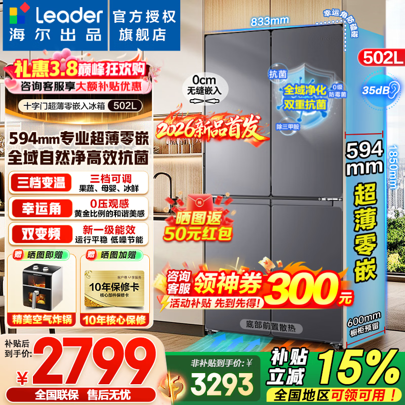 Leader统帅海尔冰箱出品502升十字门四开门594mm超薄零嵌入式冰箱525一级能效双变频风冷无霜以旧换新 悦已系列+594mm超薄零嵌+黑金净化
