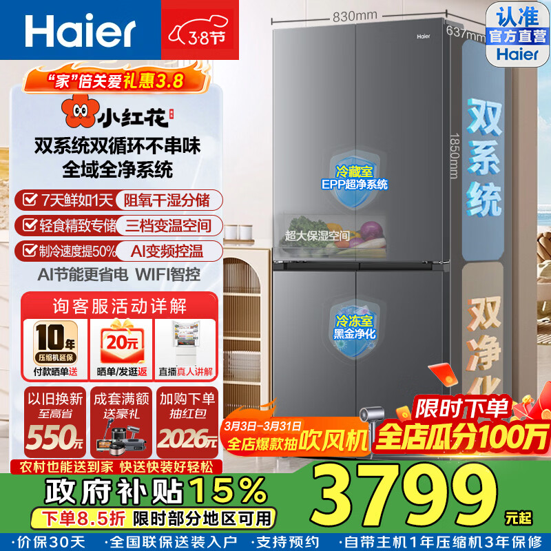 海尔(Haier)25新款小红花548升十字四门冰箱双系统双循环不串味EPP超净黑金双净化三档变温保湿区AI节能家用 BCD-548WGHTDC9FSU1咨询领政府补贴