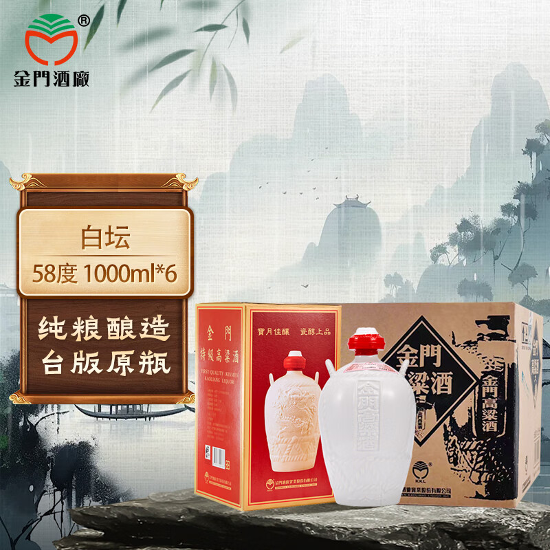 金门高粱酒 白坛 清香型白酒 58度1000ml*6坛 整箱装 台版原瓶