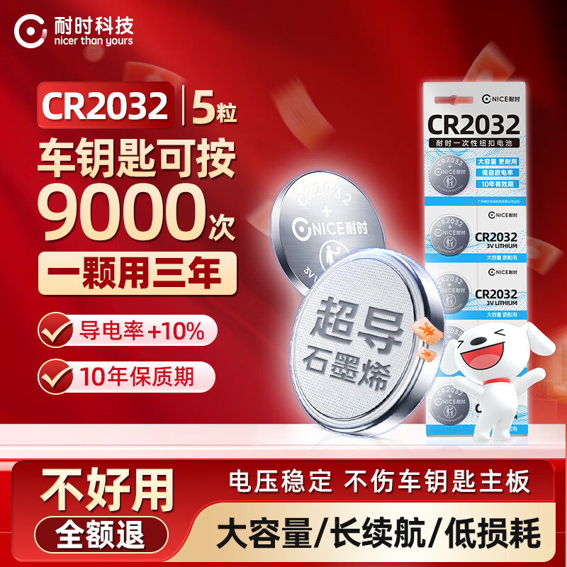 耐时(NICE)耐时石墨烯CR2032纽扣电池3V锂电池大众/奥迪/现代/等汽车钥匙/遥控器/耳温枪等 限时5粒特价|CR2032