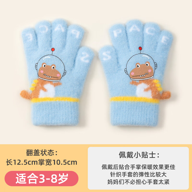牧萌儿童手套冬季保暖男童女童五指卡通恐龙小学生全指针织手套 天蓝色小恐龙 均码【建议3-8岁】
