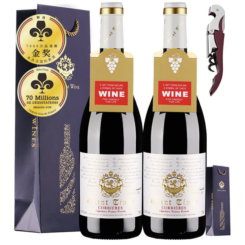 圣汀格法国原瓶进口AOC/14.5度 红酒 自饮整箱6瓶红酒 送礼礼盒装葡萄酒 【原瓶进口】2瓶配礼袋装