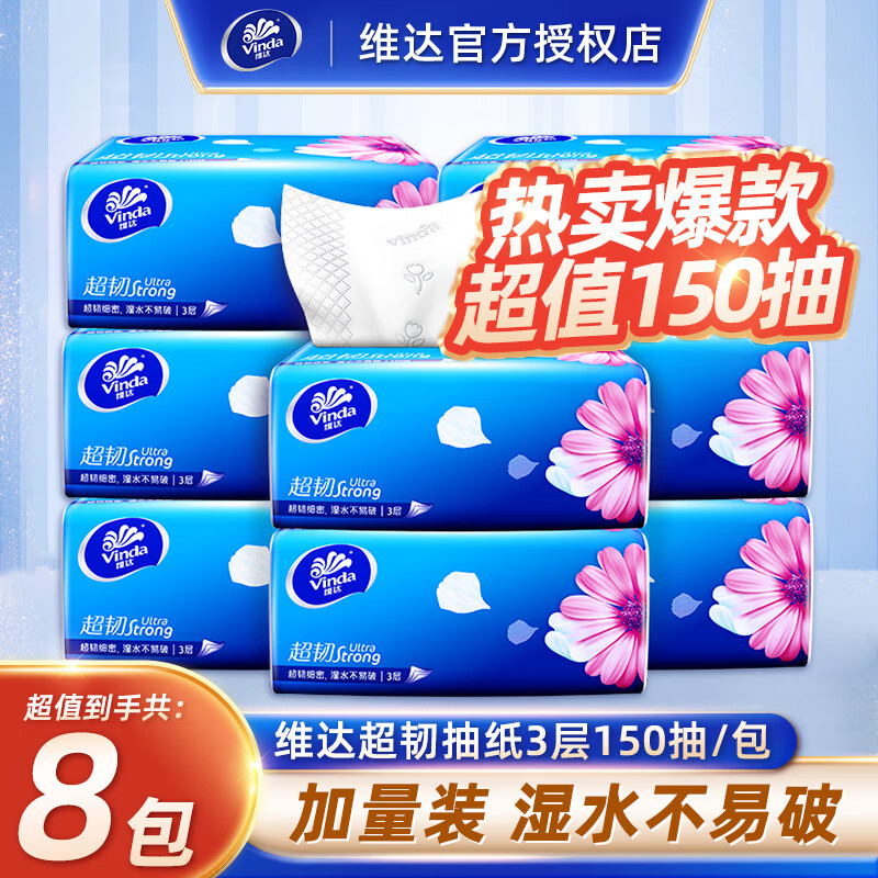 维达(Vinda)超韧抽纸3层150抽餐巾纸抽纸面巾纸卫生纸巾整箱 3层 150抽*8包