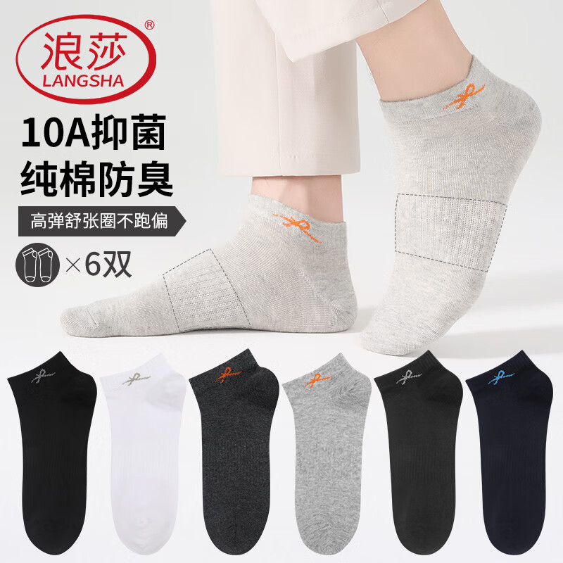 浪莎袜子男船袜纯棉薄款秋季短袜10A抗菌防臭袜6双男生全棉短筒运动袜