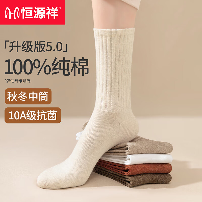 恒源祥袜子女棉袜秋冬100%纯棉中筒袜轻运动吸汗长袜10A抑菌防臭女 5双装(2本白2米色1卡其)
