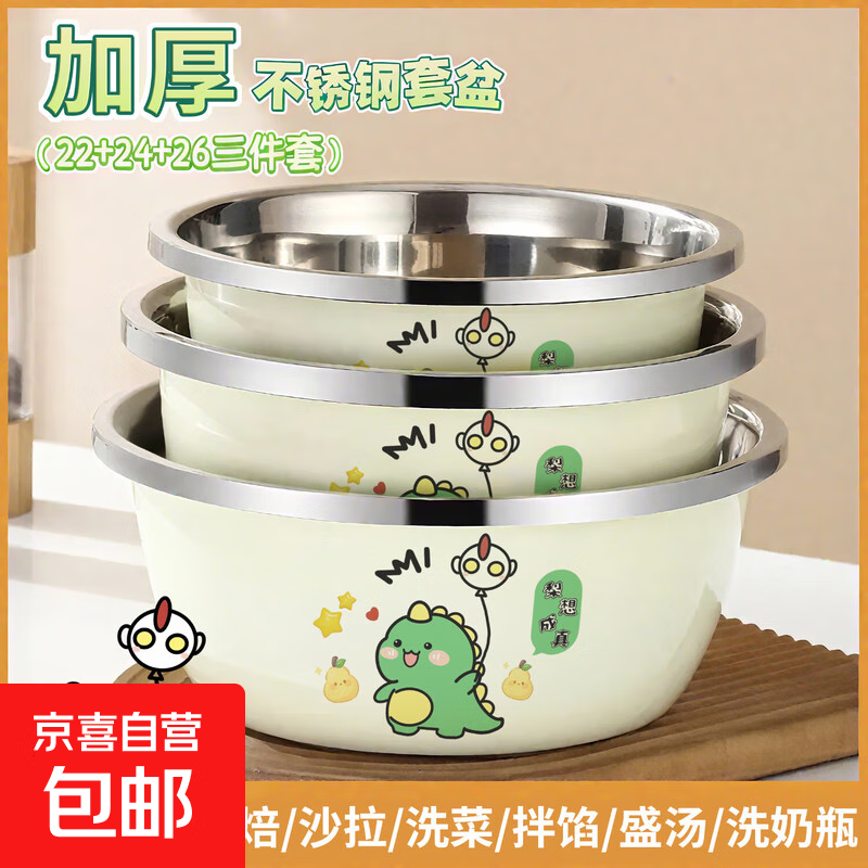 不锈钢盆套装洗菜沥水盆家用油盆厨房打蛋和面汤盆可爱卡通小恐龙 卡通恐龙盆【20cm】-一个装
