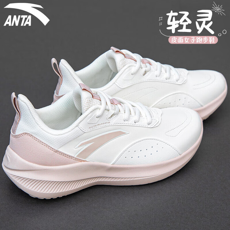 安踏(ANTA)女鞋运动鞋子女秋季新款皮面防泼水跑步鞋户外潮流休闲鞋跳绳鞋 象牙白/藕灰 (皮面) 38