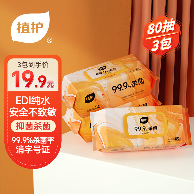 植护99.9%卫生杀菌湿巾80片*3包 茶树精油洁肤家庭装加大加厚带盖抽取