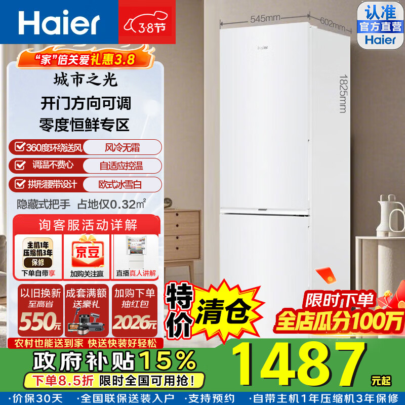 海尔(Haier)城市之光285升两门冰箱风冷无霜开门方向可调零度恒鲜一级能效小户型租房节能冰箱 BCD-285WGHC2DEWV