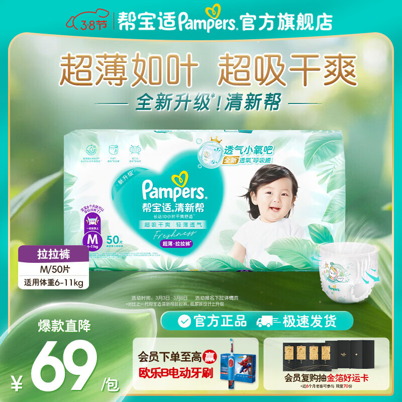 帮宝适【超薄透气】新清新帮透氧Pro拉拉裤 婴儿拉拉裤尿不湿尿裤 【超值爆品】M50片(6-11kg)