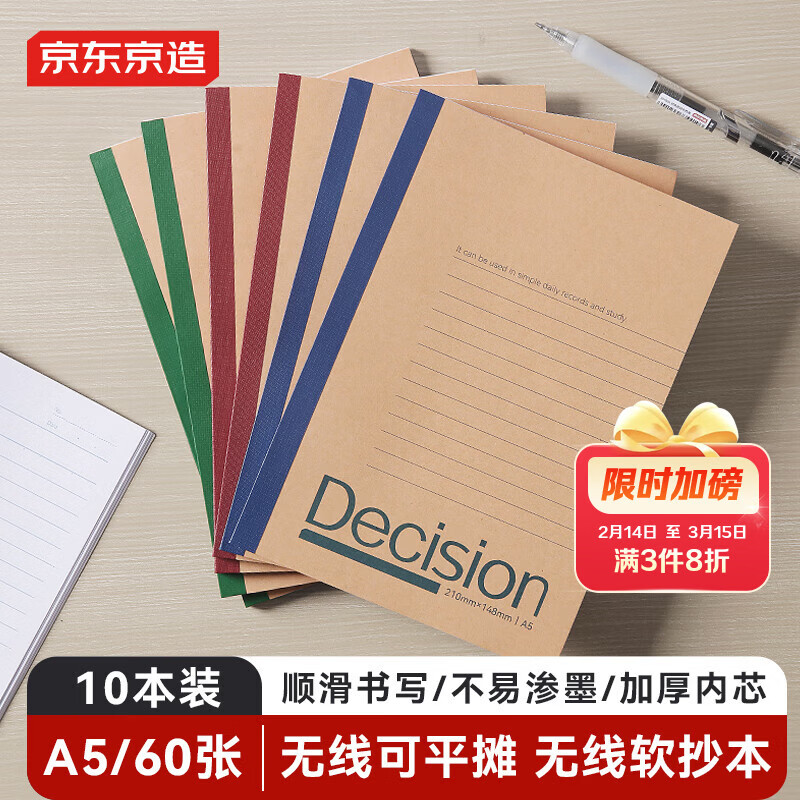 京东京造10本装A5 60张 牛皮纸无线装订软抄本记事本/ 工作笔记本子/ 日记本办公