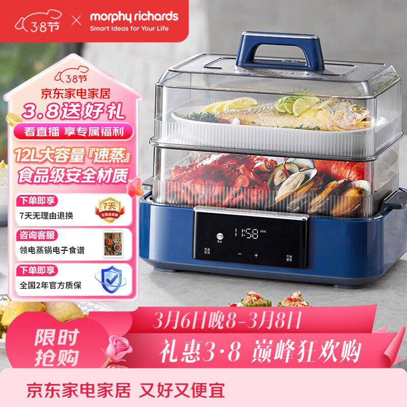 摩飞电器(Morphyrichards)电蒸锅多功能锅 家用12L大容量预约定时保温蒸炖锅速蒸锅电炖锅隔水炖煮锅 MR1158 蓝色