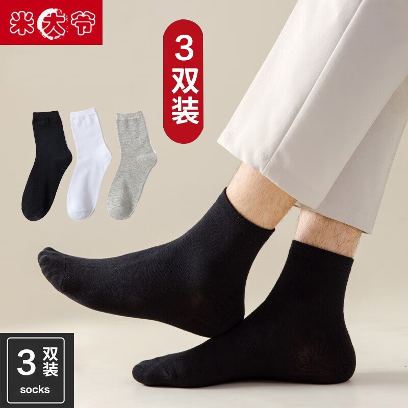 米大爷3双袜子男士春秋季中筒袜子黑白灰纯色舒适透气休闲男袜 黑白灰中筒袜 3双 均码 (37-42码)