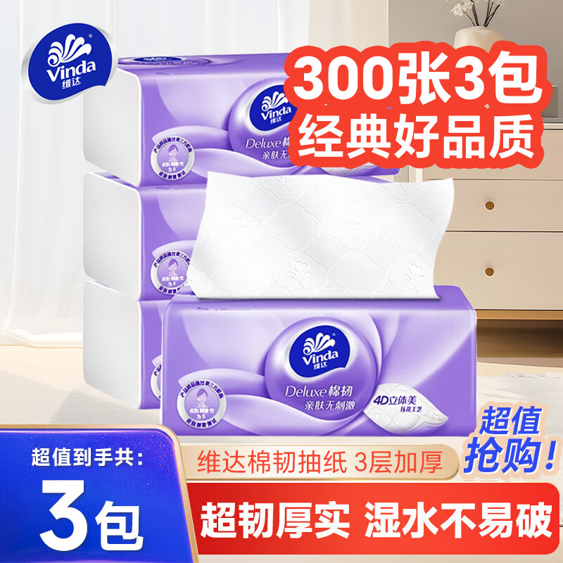 维达(Vinda)抽纸棉韧立体美 3层100抽纸巾家用卫生纸 3层 300张*3包