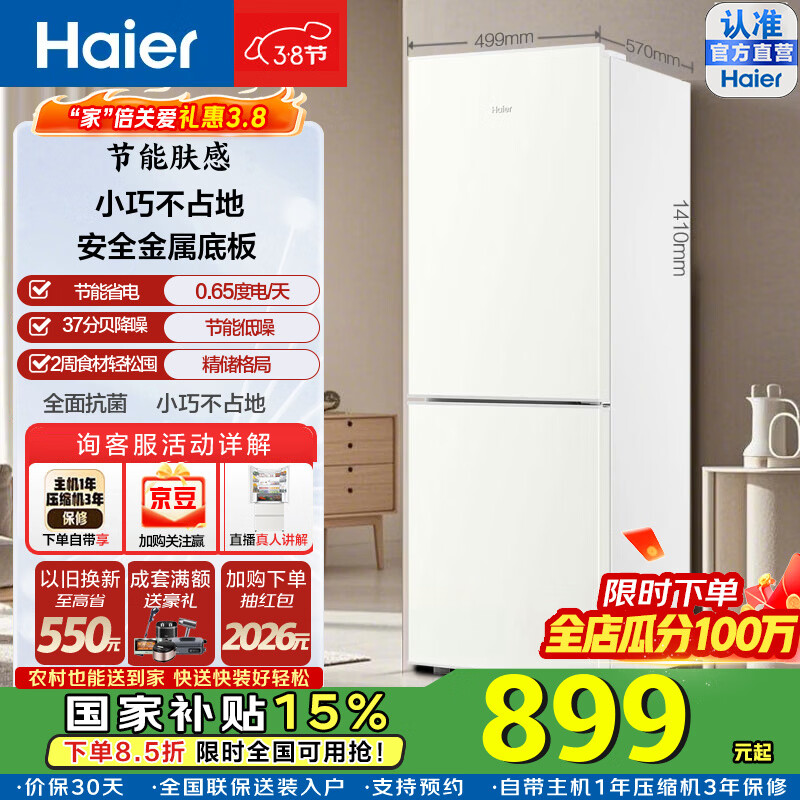 海尔(Haier)冰箱风冷无霜一级能效小型双开门小冰箱家用超薄节能黑金净味宿舍租房智能电冰箱以旧换新家电补贴 165升风冷一级+2天约1度电+35分贝超安静