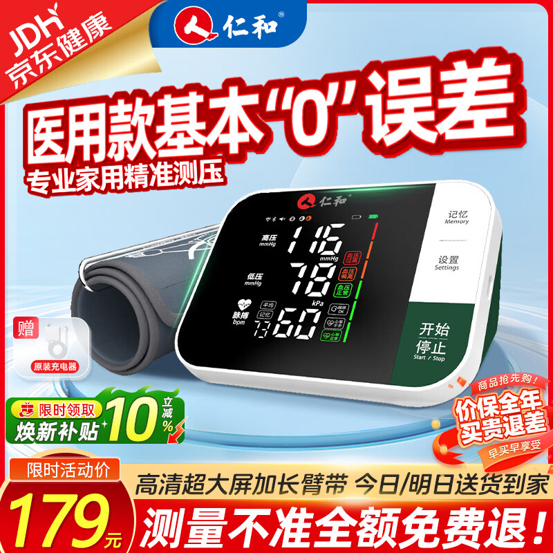 仁和【金榜热卖】血压计血压仪家用测量仪医用高精准电子血压计臂筒式 【新升级超大屏】(加长臂带更舒适)RH-4B