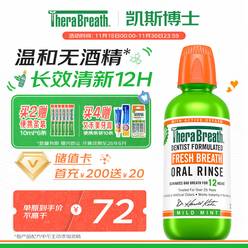 TheraBreath凯斯博士漱口水温和薄荷473ml 清新口气减少细菌持久去口臭