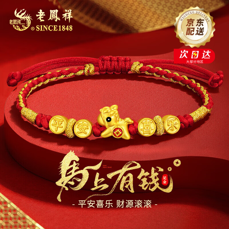 老凤祥马年本命年黄金手链女士足金转运珠红绳新年情人节礼物送女友老婆 足金平安喜乐马上有钱手绳+马年限定礼盒