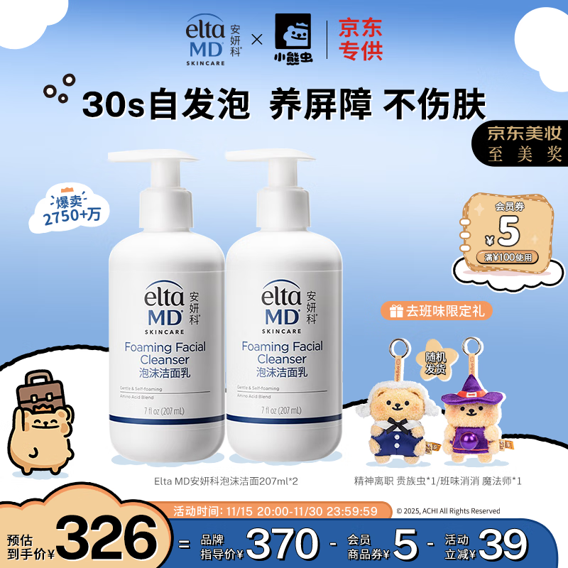 Elta MD安妍科洗面奶男女士氨基酸敏感肌泡沫洁面207ml*2温和清洁卸防晒