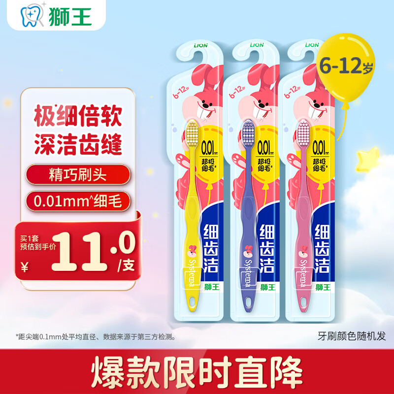 狮王(Lion)细齿洁儿童牙刷宝宝婴儿超细毛软毛牙刷6-12岁3支装 新老包装随机