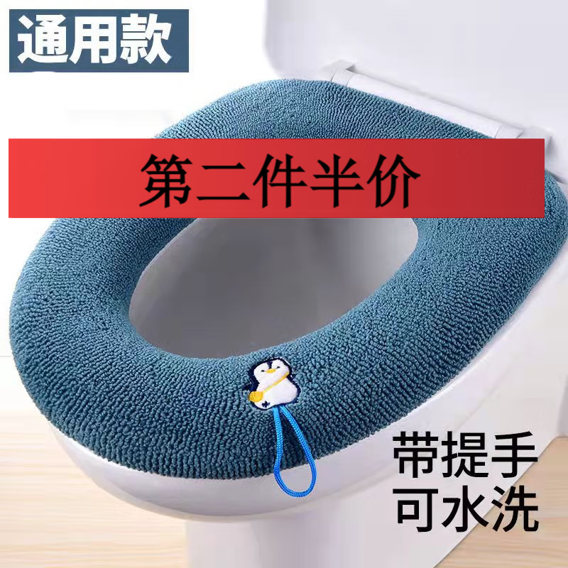 宜思家(YISIJIA)加厚马桶坐垫针织马桶坐垫家用冬季纯色马桶坐便器圈垫可水洗坐垫 青色企鹅带提手