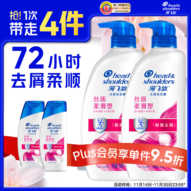 海飞丝去屑洗发水男女士丝质柔滑500g*2+80g*2洗头膏柔顺套装刘宇宁同款