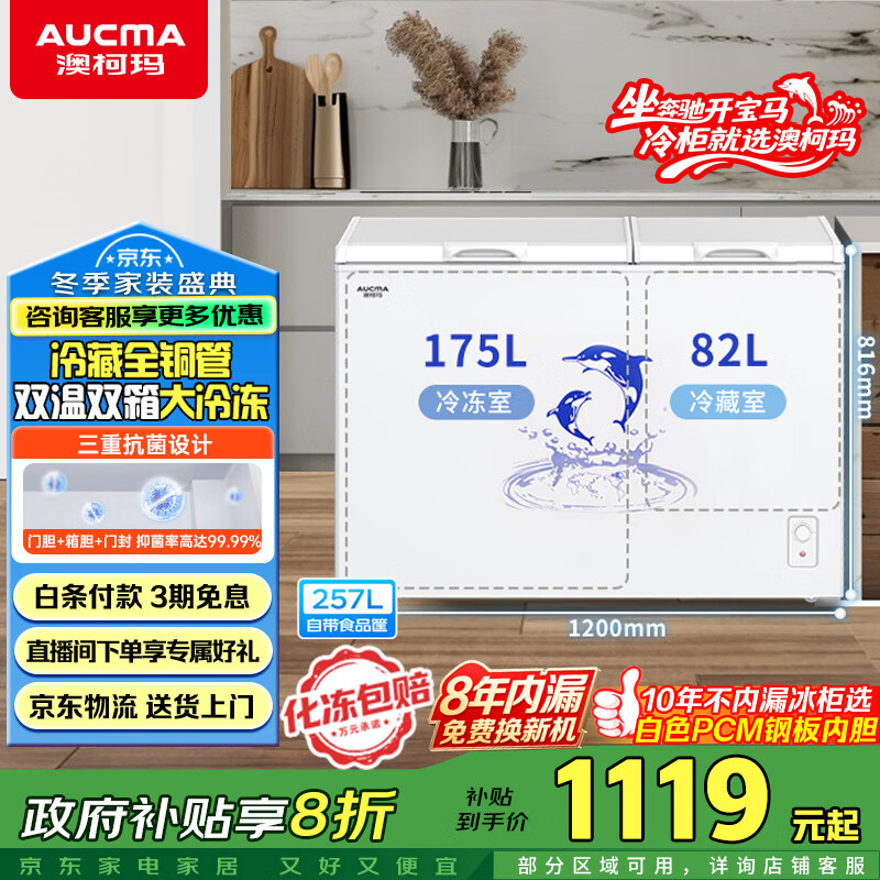 澳柯玛(AUCMA)257升家用冰柜 大冷冻小冷藏卧式双温冰柜 小型冰箱双温冷柜 一级能效 BCD-257CHN国家补贴