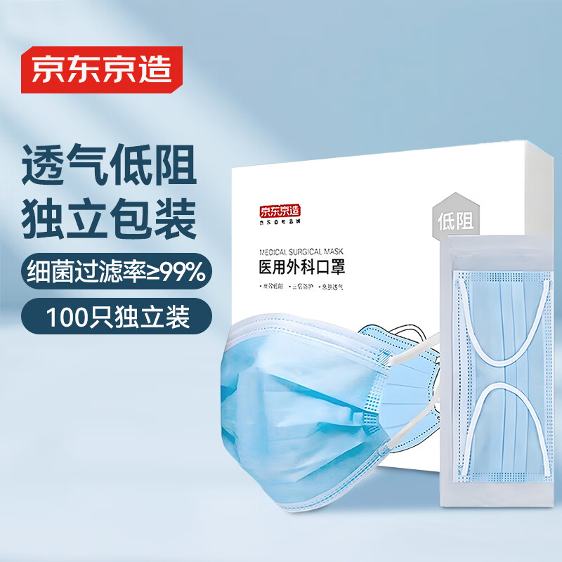 京东京造 一次性医用外科口罩100只独立包装【透气系】 防尘防晒面罩蓝色