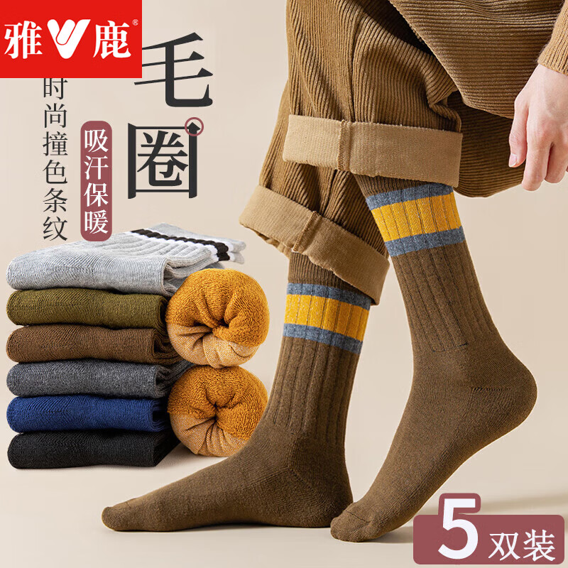 雅鹿【5双装】加厚长筒袜子男士加绒毛圈东北季保暖毛巾底潮袜男生袜 复古条纹毛圈袜 5双 均码