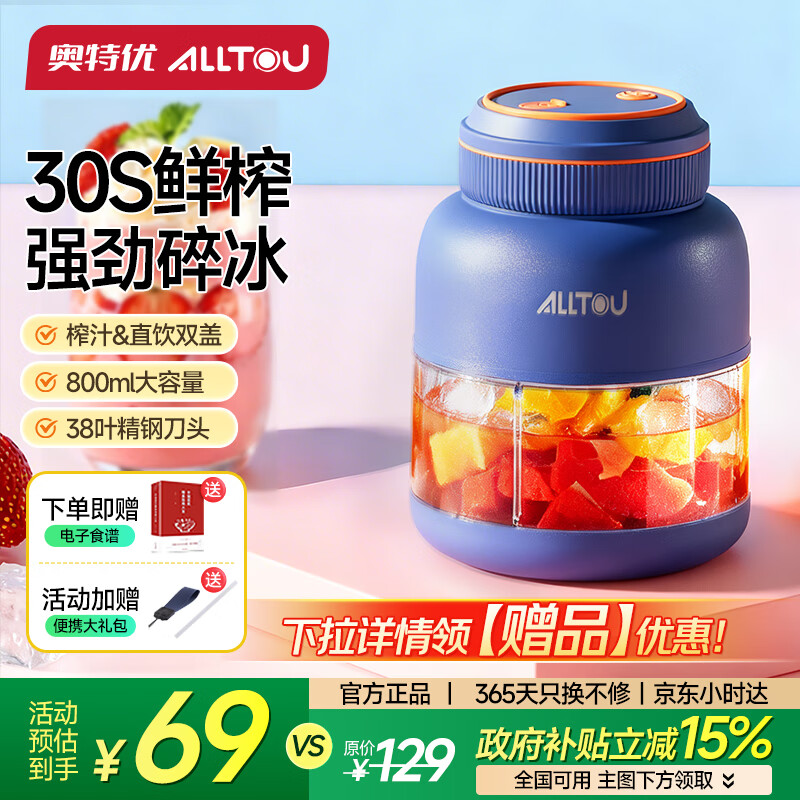 奥特优(AOTEYOU)榨汁机果蔬原汁机小型便携式榨汁杯吨吨桶鲜榨果汁机全自动家用料理机多功能冰沙奶昔机电动搅拌杯 双盖【800毫升】宝石蓝-38叶精钢刀头+食谱 【一杯双盖】秒碎冰