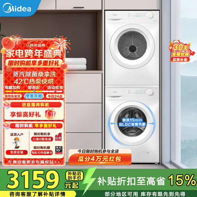美的(Midea)洗烘套装10KG滚筒洗衣机+热泵烘干机 巴氏除菌除螨除毛絮神器毛白色套装 家电补贴 MG100V11FPRO+MH100V11F