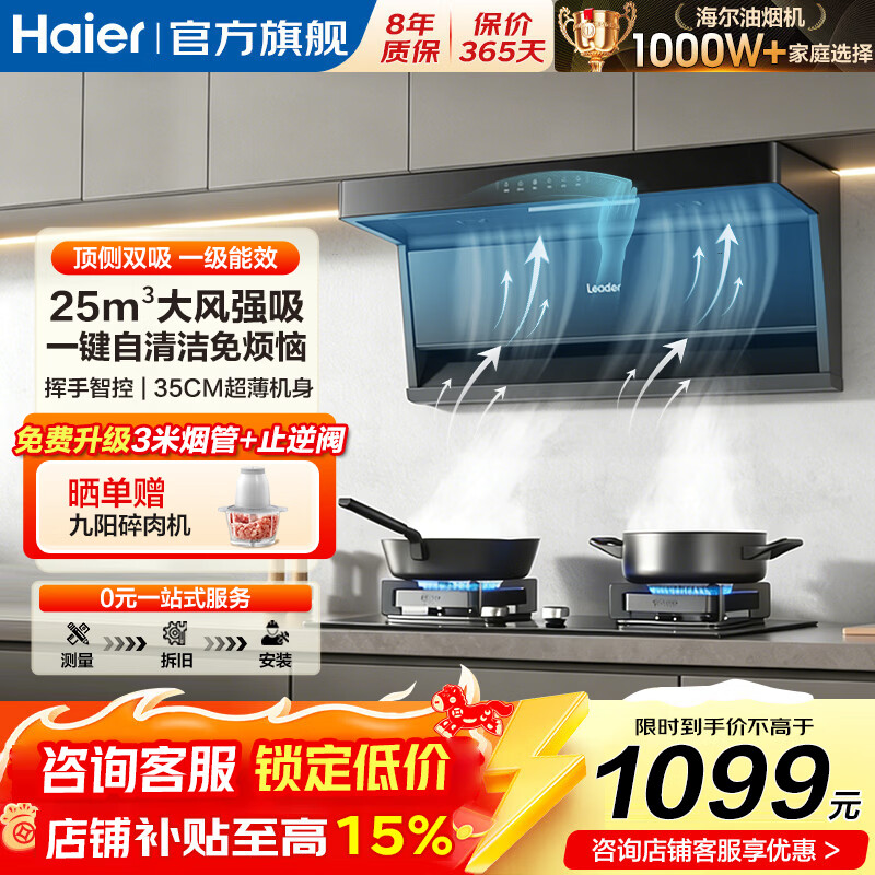 海尔抽油烟机大吸力家用25风量顶侧双吸油烟机燃气灶套装自清洁灶具两三件套一级能效leader换新补贴 【单烟机】25立方大吸力|一键自旋洗|超薄机身