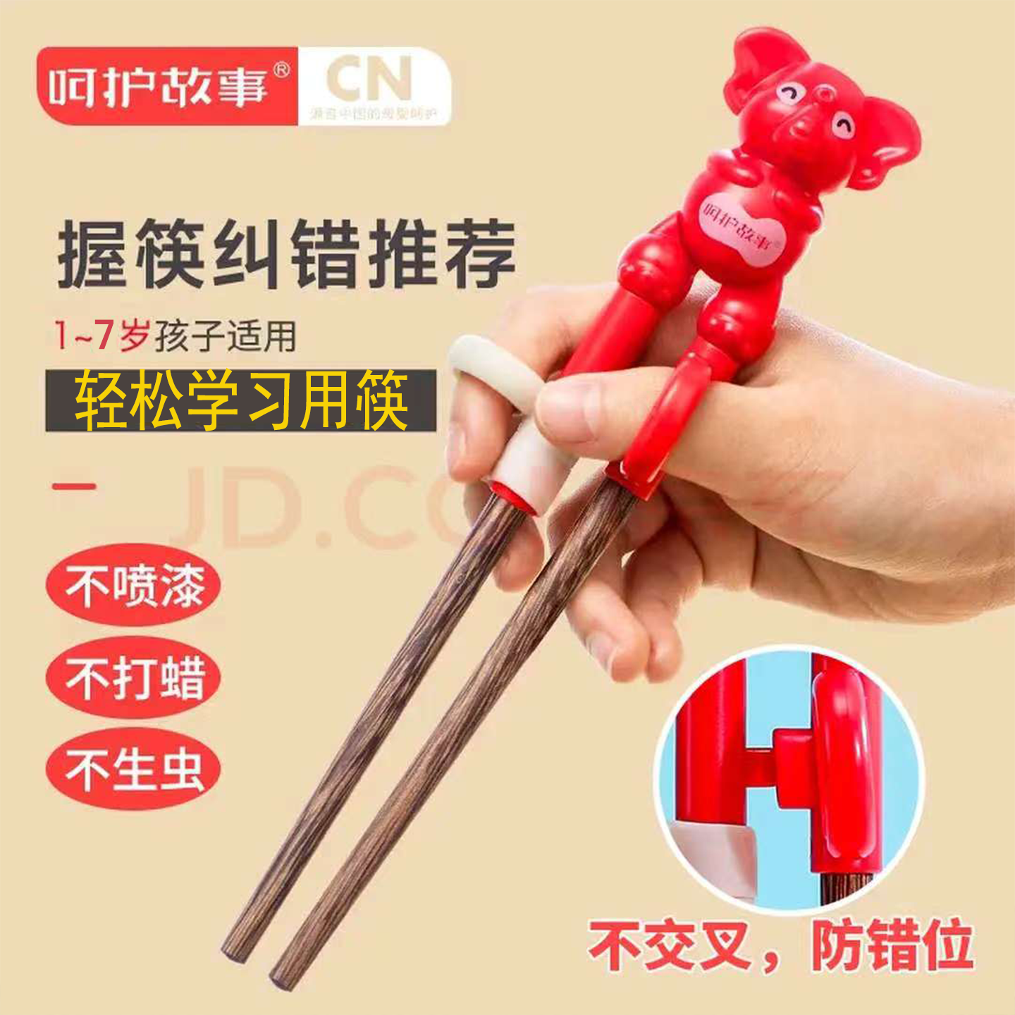 呵护故事儿童筷子训练筷1-3岁实木学习筷3-6-8岁宝宝筷子防错位练习筷专用 鸡翅木学习筷(中国红大象)