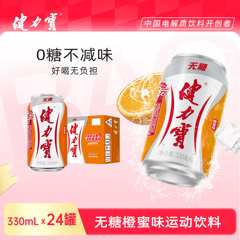健力宝无糖运动碳酸饮料0糖0卡0脂橙蜜味330ml*24罐果味补充电解质