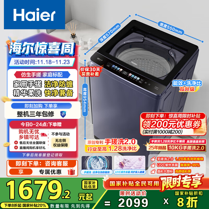 海尔(Haier)波轮洗衣机全自动10KG家用手搓洗2.0防缠绕XQB100-BSE30D3直驱变频一级能效京东自营家电国家补贴