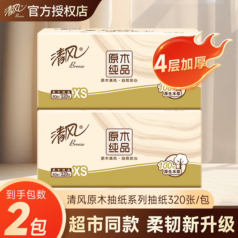 清风抽纸4层320张软抽原木纯品家用卫生纸面巾纸餐巾纸巾整箱批发 4层 320张*2包