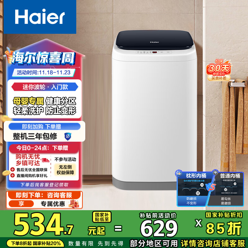 海尔(Haier)洗衣机小型全自动 迷你婴儿内衣洗衣机租房一人用 内衣裤洗小型家用 3KG 国家补贴15%XQBM30-218