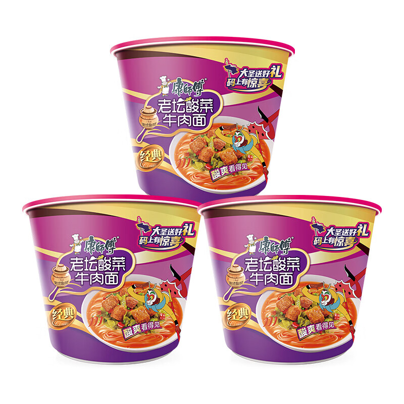 康师傅方便面 经典桶 酸菜牛肉面122g*3桶 泡面桶装速食 方便食品
