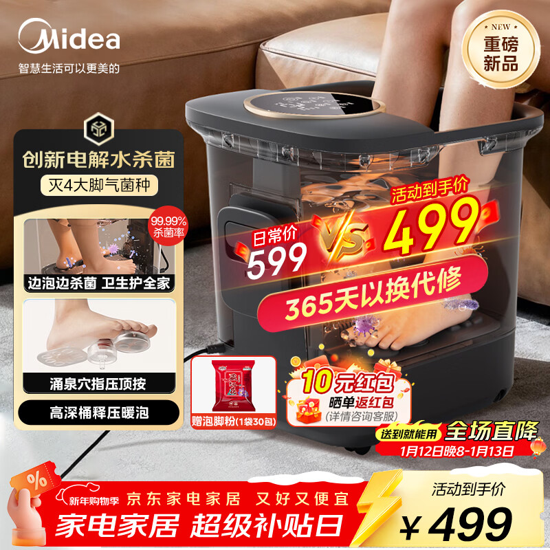美的(Midea)泡脚桶足浴盆电解水杀菌加热保暖自动按摩暖脚洗脚盆新年礼物生日送男女友长辈 ZL312海岩灰