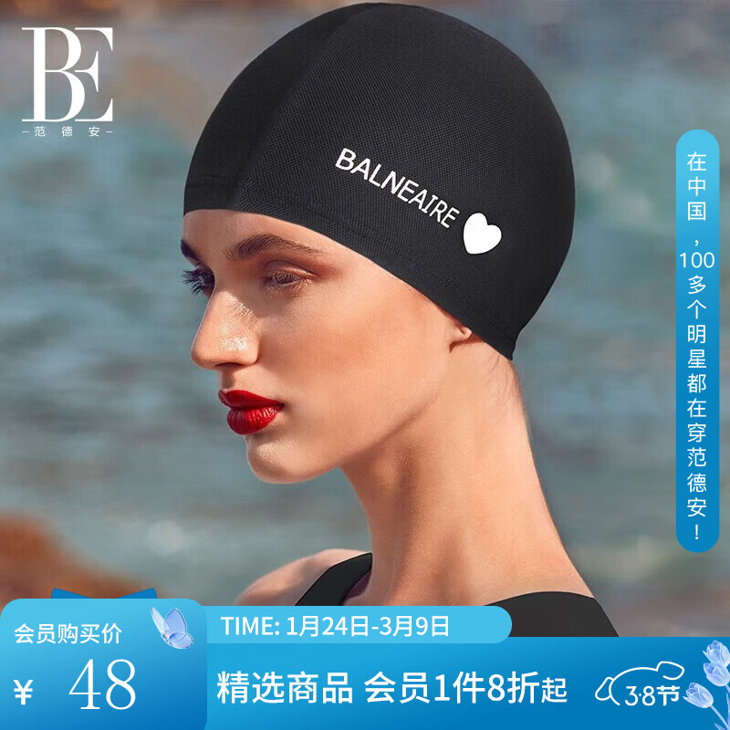 范德安(BALNEAIRE)小红心系列女男大头围贴合弹力透气长发不勒头柔软布游泳帽 30187 黑色