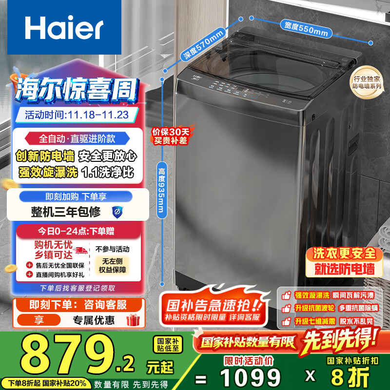 海尔(Haier)波轮洗衣机全自动家用10KG大容量 防电墙【EB100B52Mate1】家电国家补贴以旧换新直驱变频一级能效